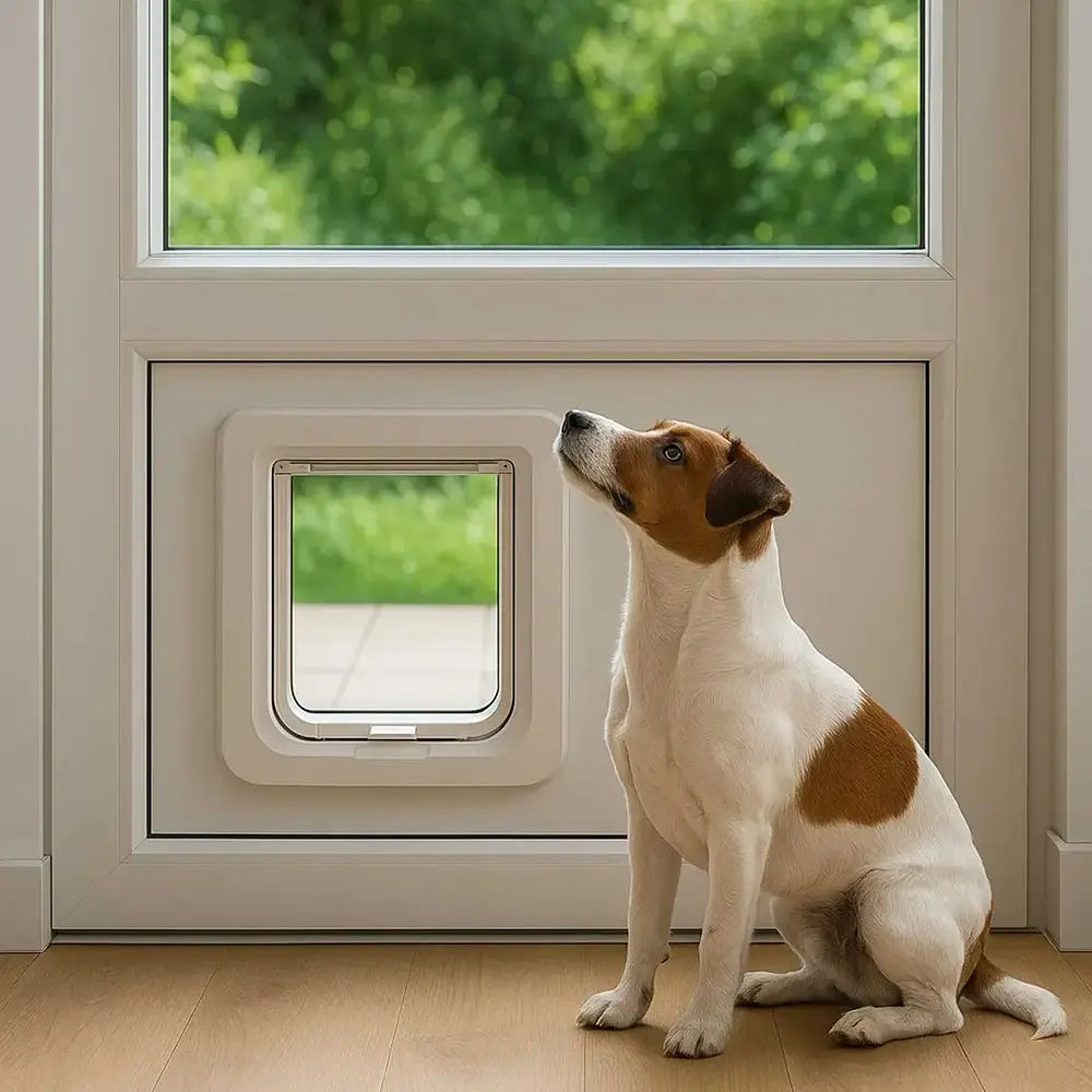 Wir tauschen die Glasscheibe professionell gegen eine neue Einheit mit passgenauer Aussparung für die Hundeklappe. Das garantiert: